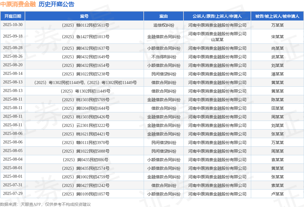 案号:(2025)闽0724民初650号审理法院:松溪县东说念主民法院案由:金融借债公约纠纷当事东说念主信息: 原告/上诉东说念主:河南华夏耗尽金融股份有限公司 被告/被上诉东说念主:周某某开庭日历:2025年7月1日字据统计,近一年内以河南华夏耗尽金融股份有限公司为当事东说念主的历史开庭公告有2108则,其中案由为“金融借债公约纠纷”的公告以1310则居首,其次为“借债公约纠纷”有472则,“小额借债公约纠纷”有139则。历史开庭公告(前20条)如下: