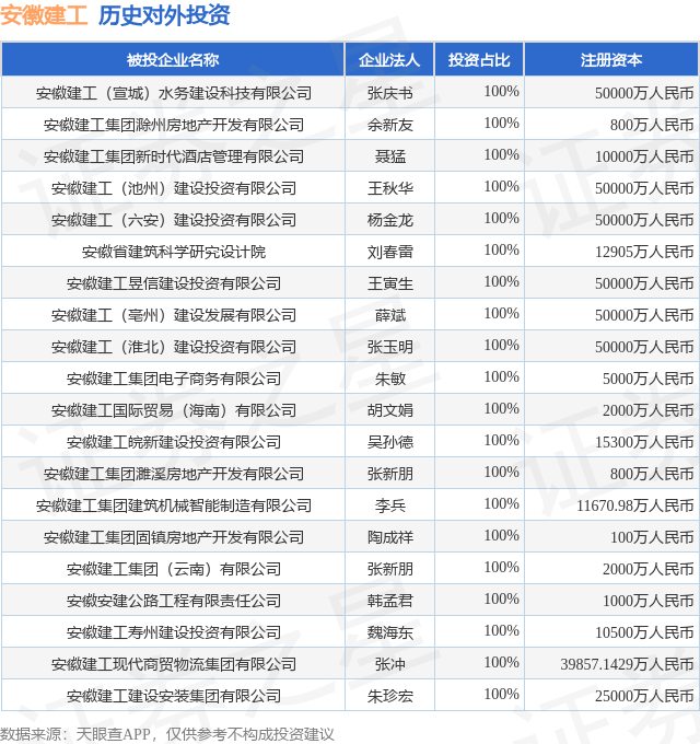 本站音问,笔据天眼查APP裸露,安徽建工(600502.SH)新增沿途对外投资事件,被投资公司为安徽建工集团(重庆)璧北合高速公路有限公司,法定代表东谈主洪杰,投资占比为91%。该公司从事土木匠程拓荒业,注册本钱为10000万东谈主民币。现在,安徽建工共存在对外投资135项,投资占比前20的技俩见下表: